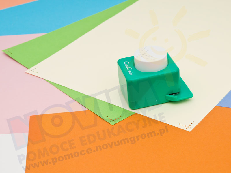 Trwałe i bezpieczne przybory do dekorowania papieru pozwalają na wykonywanie w nim aplikacji o pięknych i unikatowych kształtach. Wykrawając ażurowe motywy, dodają pracom plastycznym lekkości i delikatności, a tym samym stają się sposobem na uzyskanie subtelnej ekspresji uczuć oraz dzieła. Interesująco wzbogacając asortyment tzw. środków artystycznego wyrazu, wspaniale motywują dzieci do realizowania kolejnych zadań plastycznych. Są niezastąpione w tworzeniu oryginalnych papierów listowych czy fantazyjnych laurek lub zaproszeń. Dekorując narożniki, eksponują w pracach i przedmiotach miejsca zwykle nieeksploatowane, trudno dostępne, a posiadające wiele walorów ekspozycyjnych. Wym: 2 cm.