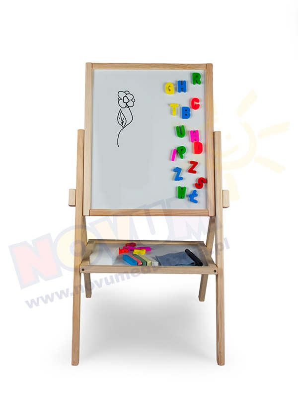 Magnetyczna czy kredowa? Jaką tablicę do nauki pisania i liczenia wybrać dla przedszkolaków, magnetyczną czy kredową? Już teraz nie musisz wybierać pomiędzy zaletami obu tablic. Z jednej strony klasyczna kredowa, do pisania kredą markerami kredowymi, z drugiej strony magnetyczna, na magnesy i do pisania kolorowymi markerami. Wystarczy za pomocą obrotu zmienić powierzchnię. Wykonana solidnie w stylu klasycznym, z drewna i wysokiej jakości materiałów. Zawiera komplet akcesoriów w zestawie do nauki liczenia i pisania. Idealana dla grupy trzylatków. Zalety tablicy: - tablica 2 w 1, kredowa i magnetyczna, - wykonana z drewna w stylu klasycznym, - tablica jest składana dzięki czemu zajmuje mało miejsca, - w zestawie 5 kolorów kredy, - marker, - gąbeczka, - polar do wycierania markera, - drewniane elementy konstrukcji są zaokrąglene i wygładzone, - zestaw magnetycznych liter, - praktyczna półka na przybory,- produkt polski. Do tablicy można dokupić: 4255432 Magnetyczne litery małe4255433 Magnetyczne cyfry i symbole matematyczne6302867, 6302868, 6302869, 6302870 Markery kredowe Pozostałe informacje Stelaż wykonany z drewna. Pakowana w karton. Wymiary całej tablicy: 46 x 43 x 78 cm, wymiary pola do pisania 39 x 31 cm