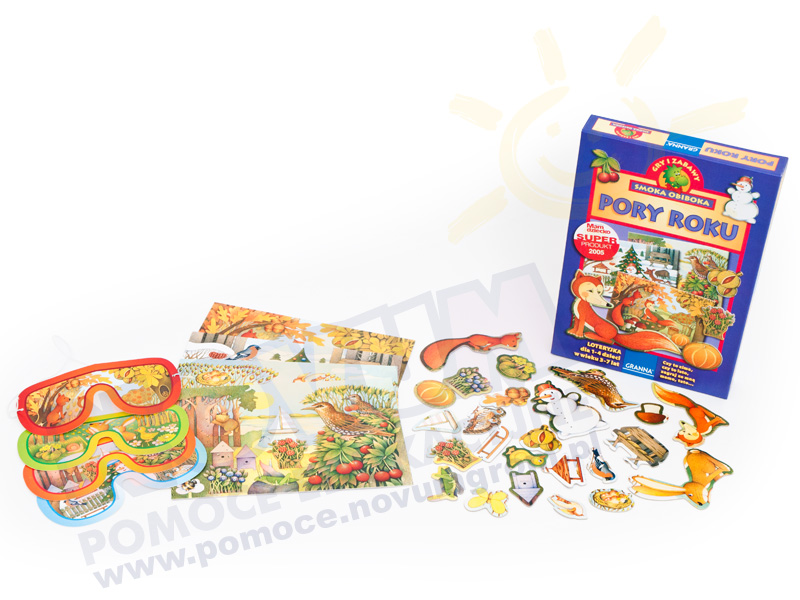 Loteryjka obrazkowa, porządkuje wiedzę dzieci o zmianach zachodzących w przyrodzie w ciągu roku. Każde dziecko ma okulary, jest inną porą roku. Dotykiem znajduje element pasujący do swojego obrazka.