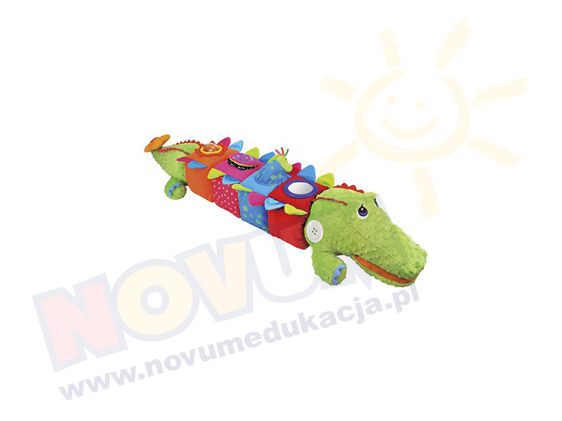 Krokodyl to zabawka wielofunkcyjna składa się z pluszowej głowy, ogona i 4 miękkich kostek, na których znajdują się m.in. bezpieczne lusterko, ramka na zdjęcie, grzechotka, kieszonka z małym pluszakiem krokodyla można powiększyć poprzez połączenie jego głowy i ogona klockami pomniejszyć poprzez połączenie głowy i ogona w paszczy krokodyla znajduje się doczepiony motylek na jego ogonie umieszczony jest kwiatek, który po pociągnięciu wibruje krokodyl może służyć jako przytulanka lub poduszka
