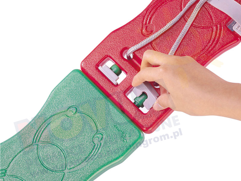 Zestaw kolorowych paneli ze sznurkowymi uchwytami jest przeznaczony do ćwiczeń kształtujących mięśnie nóg, ramion i tułowia. Niezastąpiony w kształtowaniu skoordynowanej pracy kończyn jednego lub kilku użytkowników jednocześnie. Jako połączona całość znakomicie wpływa na naukę trudnej umiejętności synchronizowania ruchów wielu współdziałających ze sobą osób. Wdrażając do pracy zespołowej, oddziałuje wychowawczo: wpaja przekonanie o konieczności chwilowego podporządkowywania się wartości nadrzędnej, jaką jest dobro grupy. Formuje poczucie odpowiedzialności indywidualnej za wyniki drużyny. Wiek użytkowników od 4 lat. Komplet 4 pary. Wym. jednego elementu: dł. 39,5, szer. 12,5 , wys. 2,5 cm
