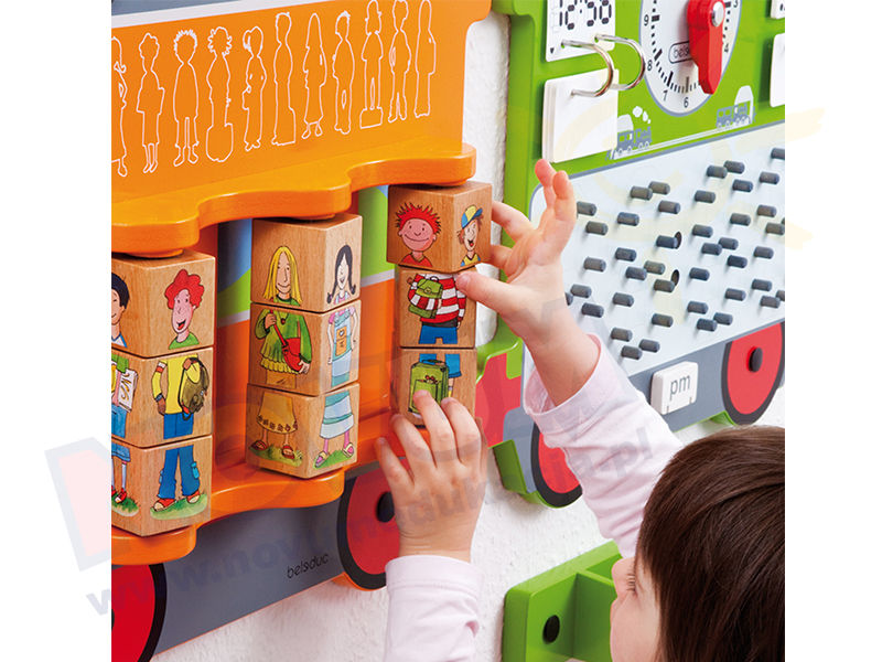 Piaskownica do zabawy dla dzieci z atrakcyjnymi aplikacjami siedzisk w kształcie glowy misia i koła z logo NOVUM. Panel interaktywny z przesuwnymi elementami, sklepik i liczydlo.