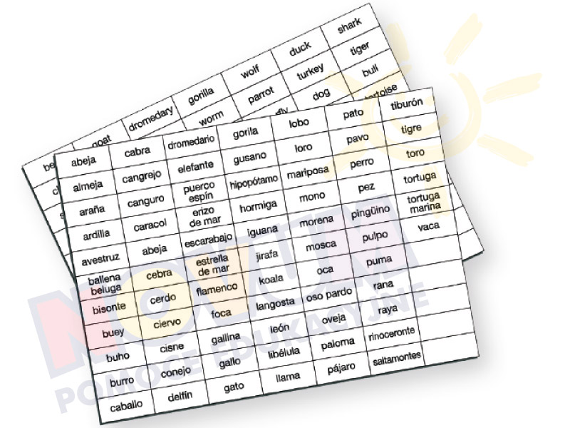 Loteryjka ćwicząca praktyczną umiejętność posługiwania się językiem angielskim. Gra sprawdza stopień zapamiętania przez uczniów nazw zwierząt, uczy dopasowywania, porównywania, klasyfikacj. W grze uczestniczyć może 12 dzieci. W zestawie: 12 kart po 6 obrazków o wym.: 18 x 12 cm, 72 tafelki o wym.: 5,5 x 5,5 cm oraz 72 nalepki z angielskimi nazwami. Karty wykonane są ze sztywnego 2,5 mm kartonu.