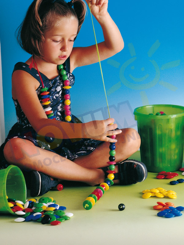 Perły manipulacyjne z tworzywa sztucznego. W zestawie wiaderko z przykrywką. Wiaderko 1,5 l. mieści 200 szt pereł o śr. 3,1 cm.