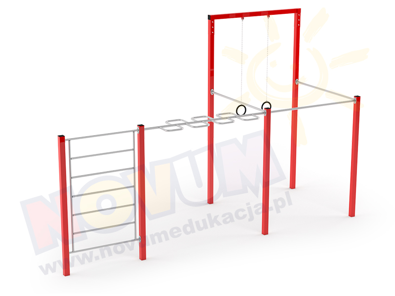 Elementy konstrukcyjne z rur stalowych: 42,4; 33,7; Słupy zabezpieczone antykorozyjnie poprzez pokrycie warstwą cynku i malowanie farbą proszkową gładką. Słupy nośne z profilu stalowego kwadratowego 90x90 mm, osadzone bezpośrednio w gruncie na głębokości 80 cm. Kółka gimnastyczne zamocowane na łańcuchach, wykonane z rury stalowej. Drążki zabezpieczone antykorozyjnie poprzez pokrycie warstwą ocynku galwanicznego.