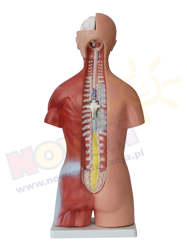 Model tułowia człowieka wykonany z trwałego tworzywa sztucznego, z wyjmowanymi organami ludzkimi składający się z 23 części, których budowa i kształt odpowiada cechom anatomicznym poszczególnych organów ludzkich. Model przystosowany do prezentacji w pozycji pionowej. W skład modelu wchodzą następujące elementy: korpus z jednostronnie zaznaczonym układem mięśni i ścięgien (1 część), zdejmowana i częściowo rozkładana głowa przedstawiająca przekrój czaszki, mózgu wraz z wyjmowaną gałką oczną (3 części), płuca (2 części), serce (2 części), wątroba (1 część), żołądek (2 części), przód nerki (1 część), jelita (4 części), narządy rozrodcze męskie (2 części), narządy rozrodcze żeńskie wraz z płodem (3 części), część piersiowobrzuszna wraz uwidocznionym gruczołem piersiowym, na wewnętrznej części uwidocznione są żebra (1 część), zaznaczony kręgosłup, wraz z wyjmowanym kręgiem piersiowym (1 część). Wysokość modelu 45 cm