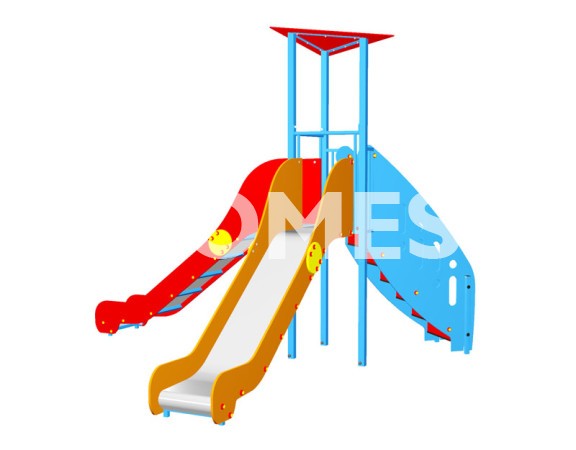 Wyposażona w podwójny ześlizg, zadaszoną wieżyczkę oraz wejście w postaci schodków zjeżdżalnia, to rozwiązanie odpowiednie zwłaszcza na małe place zabaw. Urządzenie zapewni zabawę nawet ośmiu małym użytkownikom, w przedziale wiekowym od 3 do 15 lat. Stalowa konstrukcja, stopnie i podłoga z wodoodpornej sklejki antypoślizgowej, daszek i wypełnienia z tworzywa HDPE – wszystko to zapewnia trwałość i bezpieczeństwo użytkowania. Produkt spełnia wymogi polskiej normy PN-EN 1176:2009, co potwierdzają certyfikaty wydane przez Biuro Badań i Certyfikacji COBRABiD w Warszawie.