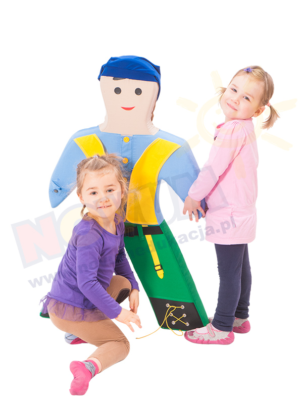 Piankowa postać pomoże maluchom opanować trudną sztukę zapinania guziczków, klamerek, manipulacji przy sznurówkach, operowania suwakiem, a nawet zakładania czapeczki! Wym.: 100 x 57 x 10cm