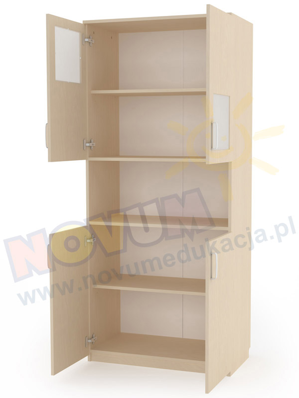 Szafa zamykana na kluczyk, z dwoma podwójnymi drzwiczkami, wyposażona w regulowane półki, korpus posiada estetyczne metalowe uchwyty, wykonany jest z płyty w kolorze klonu. Wym.: wys. 182 x szer. 80 x gł. 42 cm