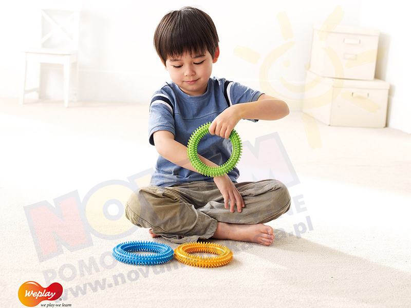 3 elastyczne krążki z kolcami o różnej twardości zapewniają kojącą stymulację dotykową (poprzez skręcanie, ściskanie, kręcenie), rozwijanie mięśni śródręcza. Stanowią znakomite ćwiczenie przygotowujące do nauki pisania. Śr. 15 cm, gr. 3 cm.