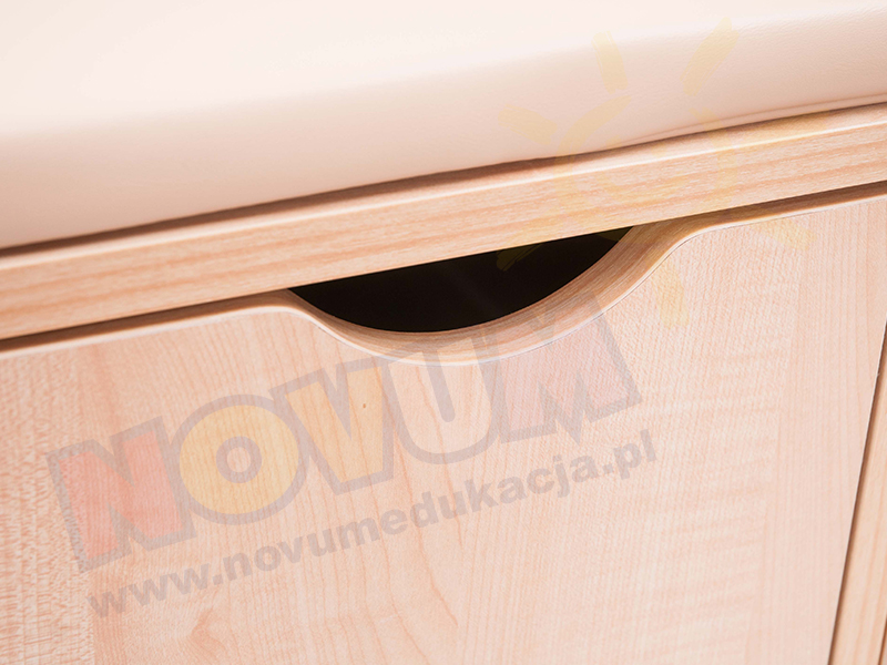 Przewijak wykonany z płyty w kolorze klonu, posiada 4 pojemne szuflady na metalowych prowadnicach z prawej i 3 półki z lewej strony. Przewijak sprzedawany jest bez materaca. Szuflady posiadają łagodne wcięcia zamiast uchwytów. Wym.: wys. 108 x szer. 100 x gł. 76 cm