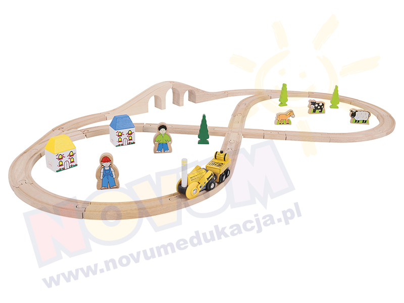 Drewniany zestaw z repliką prawdziwego parowozu. W zestawie figurki zwierząt, ludzi i budynków. W zestawie 38 elementów.