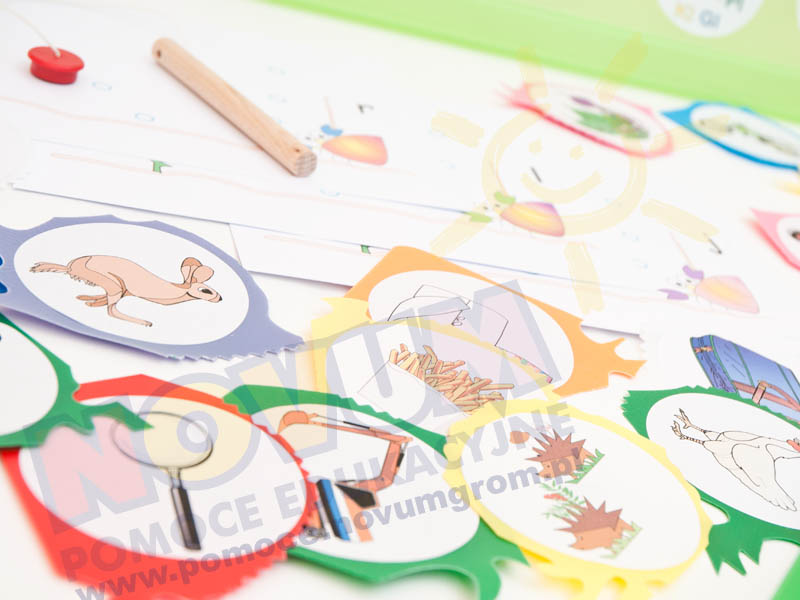 354 logopedyczne rybki W skład pakietu wchodzi 7 zestawów „Logopedycznych rybek” zapakowanych w duże plastikowe pudełko.W każdym z zestawów znajdują się magnetyczne „rybki” z obrazkami, których nazwy zawierającymi głoski, z wymową których dziecko ma problem. W każdym z pakietów znajduje się wędka, która umożliwia łowienie rybek. Zadaniem dziecka jest nie tylko złapanie rybki, ale także poprawne wymówienie nazwy znajdującego się na ilustracji przedmiotu. "Rybki" podzielone są na grupy, co pozwala wybrać obrazki umożliwiające ćwiczenie głosek, które dziecko wymawia nieprawidłowo. W zestawie 354 magnetyczne elementy - rybki i 7 wędek, całość zapakowana w plastikowe pudełko. Rybki podzielone są na następujące grupy: - Logopedyczne rybki 1, w zestawie 54 magnetyczne "rybki" z obrazkami zawierającymi głoski sz, ż(rz), cz, s, z, c oraz wędka; gra przeznaczona dla dzieci, które nieprawidłowo wymawiają głoski szumiące i syczące. - Logopedyczne rybki 2, w zestawie 48 magnetycznych "rybek" z obrazkami zawierającymi głoski ś(si), ź(zi), ć(ci), dź(dzi) oraz wędka; gra przeznaczona dla dzieci, które nieprawidłowo wymawiają wyrazy ze zmiękczeniami. - Logopedyczne rybki 3 (nie)trudne słowa, w zestawie 48 magnetycznych "rybek" z obrazkami zawierającymi głoski s, z, c, dz, sz, ż, cz, dż, ś(si), ć(ci), dź(dzi) oraz wędka; gra przeznaczona dla dzieci, które nieprawidłowo wymawiają trudne słowa. - Logopedyczne rybki 4, w zestawie 48 magnetycznych "rybek" z obrazkami zawierającymi głoski pr, br, kr, gr, tr, dr oraz wędka; gra przeznaczona dla dzieci, które nieprawidłowo wymawiają w.w. głoski. - Logopedyczne rybki 5 , w zestawie 48 magnetycznych "rybek" z obrazkami zawierającymi głoski r, l, j oraz wędka; gra przeznaczona dla dzieci, które nieprawidłowo wymawiają w.w. głoski. - Logopedyczne rybki 6 , w zestawie 60 magnetycznych "rybek" z obrazkami zawierającymi głoski p, b, k, g, t, d, pi, bi, ki, gi oraz wędka; gra przeznaczona dla dzieci, które nieprawidłowo wymawiają w.w. głoski. - Logopedyczne rybki 7, -w zestawie 48 magnetycznych "rybek" z obrazkami zawierającymi głoski w, f, wi, fi oraz wędka; gra przeznaczona dla dzieci, które nieprawidłowo wymawiają w.w. głoski. - całość zapakowana w pudełko o wym.: 39 x 29 x 9,5 cm.