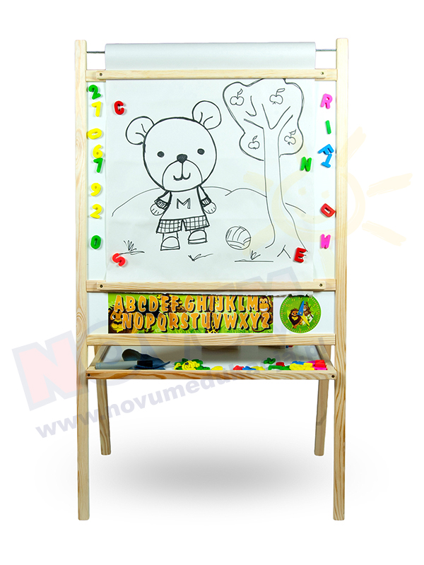Maxi tablica 5 w 1 Z jednej strony klasyczna kredowa, do pisania kredą markerami kredowymi z liczydłem, z drugiej strony magnetyczna, na magnesy i do pisania kolorowymi markerami i rolką papieru. Na samej górze tablicy znajduję się rolka papieru do rysowania o długości aż 20 metrów. Wykonana solidnie w stylu klasycznym, z drewna i wysokiej jakości materiałów. Zawiera komplet akcesoriów w zestawie do nauki liczenia i pisania. Wysokość dopasowana do wzrostu 5 i 6 latków. Zalety tablicy: - tablica dwustronna, kredowa i magnetyczna, - wykonana z drewna w stylu klasycznym, - tablica jest składana więc w razie potrzeby można ja schować do szafy,- wyposażona w rolkę papieru o długości 20 m,- w zestawie 5 kolorów kredy, - marker, - gąbeczka, - polar do wycierania markera, - liczydło z kolorowymi kulkami, - alfabet,- zestaw magnetycznych liter, - drewniane elementy konstrukcji są zaokrąglene i wygładzone,- praktyczna półka na przybory, - produkt polski. Do tablicy można dokupić: 4255432 Magnetyczne litery małe4255433 Magnetyczne cyfry i symbole matematyczne6302867, 6302868, 6302869, 6302870 Markery kredowe Pozostałe informacje Stelaż wykonany z drewna.Pakowana w karton.Wymiary całej tablicy: 66 x 40 x 116 cm