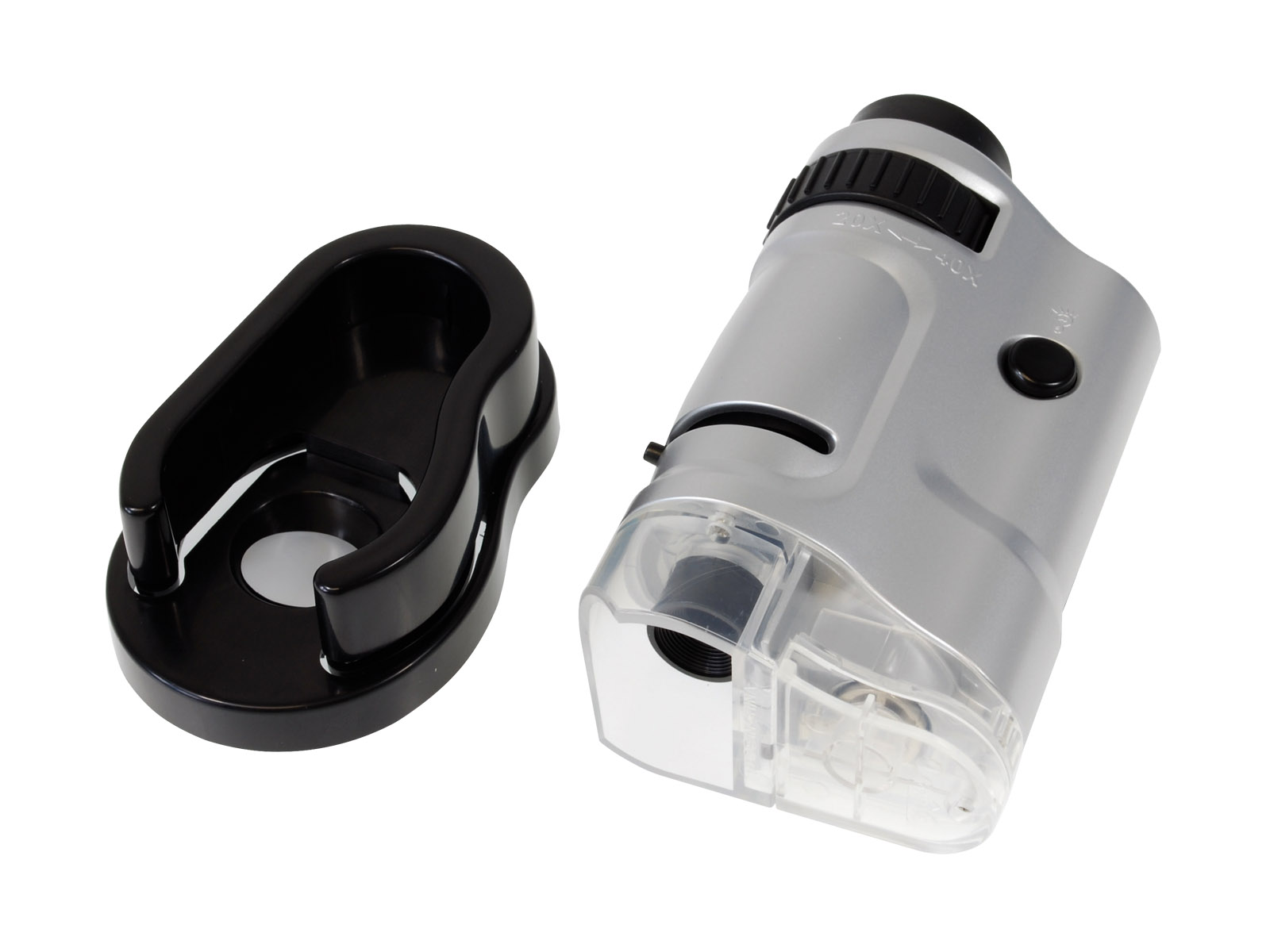 Mały, prosty mikroskop, pozwala obejrzeć obiekty w zbliżeniu 20x do 40x. Wymiary : 10 x 5,5 x 3 cm. w zestawie baterie i szkiełko.