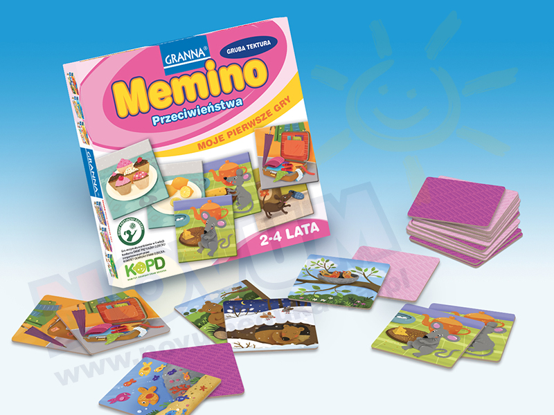 Gra składa się z 24 kartoników, na których namalowano 12 par przeciwieństw. Biały kot : czarny kot, wesoły królik : smutny królik, lato : zima, słodki - kwaśny. Reguły gry : podobne jak w klasycznym MEMO. Gra ćwiczy pamięć, refleks i spostrzegawczość.