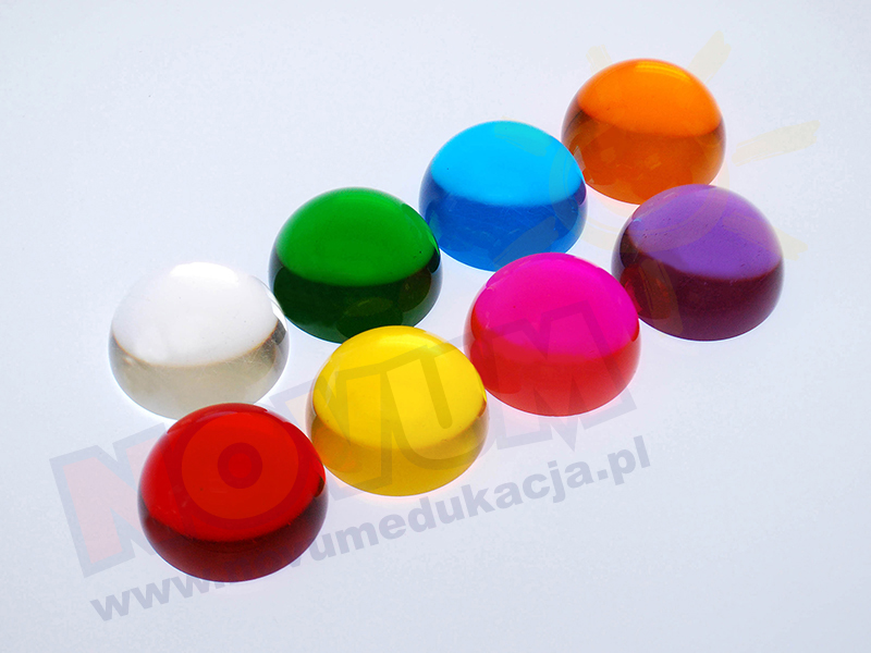 Różnokolorowe, gładkie powierzchnie półkul umożliwiają oglądanie różnych przedmiotów nie tylko w innym kolorze, ale także w 4-krotnym powiększeniu. Po złożeniu 2 różnych półkul powstają nowe kolory,dzieci poznają kolory podstawowe i pochodne. Śr.: 5 cm