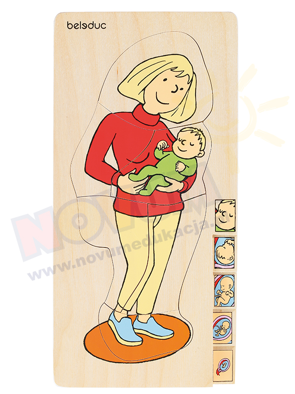 Pięciowarstwowe puzzle wykonane z lakierowanej sklejki, ukazują rozwój ciąży krok po kroku. Ilośc elementów: 27 sztuk. Przeznaczone dlla dzieci pow. 4 roku życia. Wym.: 14,5 x 29,5 x 20 cm