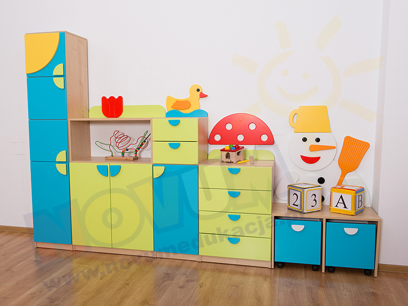 Zestaw mebli Cztery pory roku to doskonałe uzupełnienie tematycznej pogadanki z maluchami! Za co lubimy Panią Wiosnę? Co zwiastuje jesień? Tematyczna pogadanka z maluchami może być urozmaicona nie tylko poprzez zabawki lub pomoce dydaktyczne, ale także przez odpowiednią aranżację sali! Aplikacje przy każdej szafce pokazują element charakterystyczny dla każdej z 4 pór roku, co można wykorzystać przy zagadnieniu na temat zmieniających się sezonów. Funkcjonalność zestawu została spotęgowana możliwością rozszerzenia zestawu o kolejne regały lub też skomponowanie zupełnie nowego, innego, zgodnego z potrzebami oraz gustem maluchów. *Zestaw sprzedawany bez wyposażenia Zalety zestawu: - pastelowe kolory frontów i aplikacji oraz satynowa w dotyku powierzchnia potwierdzają wysoką jakość wykonania, - frezowane aplikacje nadają charakter szafkom, dodatkowo dzieci mogą wodzić paluszkiem po widocznych zagłębieniach, obrysowywać manualnie kształty widoczne na frontach, - trójwymiarowe aplikacje z lakierowanego mdf-u dodają uroku każdej szafeczce, - zaokrąglone krawędzie zwiększają poczucie bezpieczeństwa bawiących się maluchów, - szafki dopasowane gabarytami oraz elementy ozdobne dają możliwość rozbudowywania zestawu poprzez dostawianie szafek, a tym samym tworzenie ciekawych, niebanalnych konstrukcji. Istnieje możliwość uzupełnienia aranżacji w funkcjonalne siedziska, wizualnie nawiązujące do charakteru zestawu! Informacje techniczne: - korpusy szafek wykonane są z płyty wiórowej w kolorze klonu, - fronty oraz aplikacje wykonane z lakierowanej płyty MDF, - dwukrotne lakierowanie płyty zapewnia nasycenie koloru oraz jego przedłużoną trwałość, - płyta MDF posiada atest higieniczny, potwierdzający klasę higieny E1, - płyta nie rozwarstwia się pod wpływem wilgoci i temperatury, W zestawie: szafka wysoka Słoneczko 4520524F, szafka Kaczuszka 4520524D, szafka Kwiatek 4520524E, szafka Grzybek 4520524B, szafka Bałwanek 4520524A. Szafki uzupełniające zestaw: szafka z drzwiczkami 6512233, regał 6512232, szafka z szufladami 6512234, szafka niska Słoneczko 6512231. *Meble wysyłane w paczkach, wymagają samodzielnego montażu