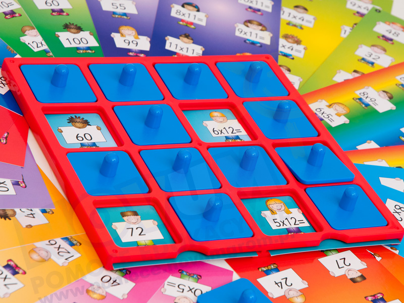 Zabawa z wykorzystaniem „trenera pamięci” polega na odnajdywaniu pasujących do siebie par: działań (mnożenie do 144) i wyników na kartach wsuwanych w ramkę z tworzywa. W ramkę można wsunąć jedną lub dwie karty. Aby podnieść poziom trudności zadania, mogą być one zamienione miejscami. Na początkowym poziomie należy wsunąć w ramkę 2 karty o tym samym numerze. Gra rozwija umiejętności matematyczne, ćwiczy wykonywanie prostych działań w pamięci, doskonali spostrzegawczość, logiczne myślenie i pamięć. W zestawie: ramka o wym. 21,8 x 21 cm,16 żetonów-przykrywek (4,4 x 4,4 cm), 24 lakierowane karty z wynikami i działaniami (21 x 10,1 cm). Wym. pudełka: 24 x 23,5 x 4,5 cm