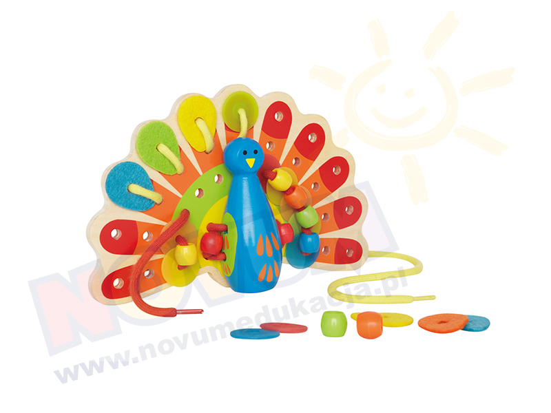 Kolorowa, drewniana układanka, składająca się z 2 łuków o różnej wysokości, które w całości tworzą postać pawia. Wym.: 23 x 2 x 8 cm. Przeznaczone dla dzieci w wieku 12m