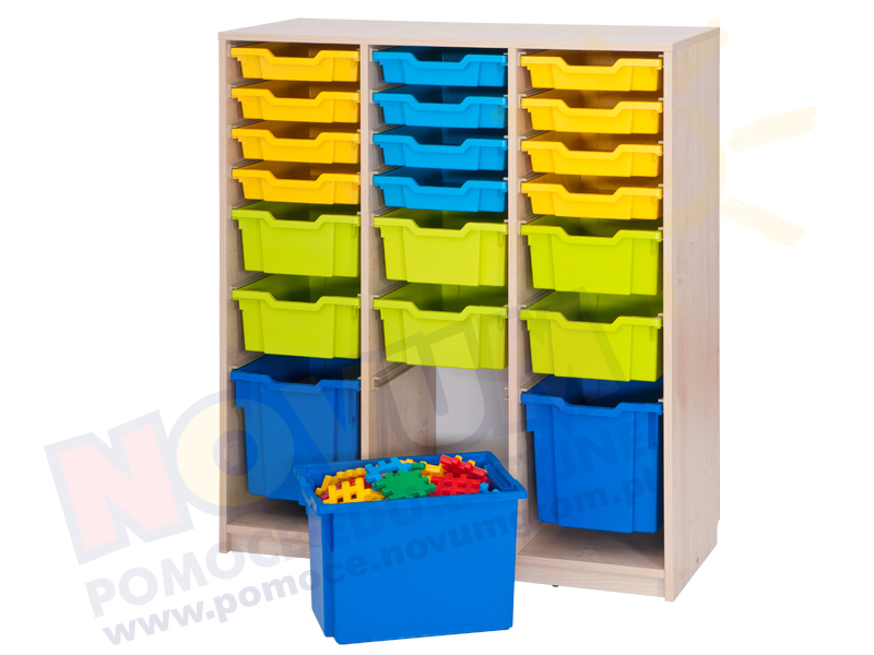 Bezpieczne i funkcjonalne - skompletuj zestaw dostosowany do Twoich potrzeb! Stwórz idealną przestrzeń z szafkami systemu Feria! System szafek Feria to mnogość możliwości dowolnego zestawiania poszczególnych modułów meblowych. Dowolne konfiguracje korpusów szafek umożliwiają stworzenie różnorodnych systemów składowania i przechowywania materiałów edukacyjnych, plastycznych czy też zabawek. Bezpieczne systemy zamykania szafek oraz wysuwania i wsuwania pojemników nie wymagają mocowania uchwytów, co zdecydowania zwiększa bezpieczeństwo bawiących się maluchów, a do tego dowolność w regulacji półek i przegródek czyni meble Feria niezwykle użytecznymi. Szafki Feria na pojemniki Gratnells Klonowe korpusy szafek dodają jasności każdemu pomieszczeniu, a wspomagane przez różnego koloru i różnej pojemności plastikowe pojemniki stanowią kompletną dekorację. Ciekawe wizualnie, a do tego praktyczne – pozwalają na segregację materiałów, a tym samym utrzymanie wzorowego porządku na wszystkich zajęciach. Otwory w korpusach pozwalają na indywidualny dobór pojemników – są dostosowane do montażu pojemników małych, średnich, dużych oraz wysokich. Do szafki dużej pasuje 36 małych pojemników. W ofercie dostępne są różne wysokości szafek na pojemniki. Zalety szafek na pojemniki: - klonowy kolor korpusów pasuje do każdej aranżacji pomieszczenia, ładnie eksponuje wszystkie kolory pojemników, - różne wysokości szafek na pojemniki pozwalają skomponować funkcjonalną przestrzeń przedszkolną oraz szkolną, - możliwość rozbudowywania zestawu poprzez dostawianie szafek, a tym samym tworzenie ciekawych, niebanalnych konstrukcji, - proste, uniwersalne wzornictwo jest gwarancją funkcjonalności i zadowolenia użytkowników. Informacje techniczne: - korpusy szafek wykonane są z płyty wiórowej w kolorze klonu, - tył szafki wykonany jest z białej płyty HDF, - otwory w szafce umożliwiają montaż prowadnic do pojemników Gratnells z dostosowaniem do ich różnych wysokości, - zamocowane ślizgacze umożliwiające wypoziomowanie szafek na nierównym podłożu. *Szafka sprzedawana bez pojemników. Pojemniki i prowadnice do nich znajdują się w oddzielnej sprzedaży. *Meble wysyłane w paczkach, wymagają samodzielnego montażu. Wym.: wys. 124 x szer. 105 x gł. 44 cm Prowadnice ze stoperem do pojemników 4980003 Oryginalne i trwałe prowadnice do pojemników Gratnells. Posiadają stopery zapobiegające wypadaniu pojemników. Małe pojemniki - Gratnells 4981005 Niebieski 4981006 Fiolet 4981007 Zielony 4981008 Czerwony 4981009 Żółty 4981014 Pomarańczowy 49810010 Transparentny 4981015 Waniliowy Średnie pojemniki - Gratnells 4982005 Niebieski 4982006 Fiolet 4982007 Zielony 4982008 Czerwony 4982009 Żółty 4982010 Pomarańczowy 49820010 Transparentny 4982015 Waniliowy Duże pojemniki - Gratnells 4984005 Niebieski 4984006 Fiolet 4984007 Zielony 4984008 Czerwony 4984009 Żółty 4984010 Pomarańczowy 49840010 Transparentny 4984015 Waniliowy Max pojemniki - Gratnells 4983005 Niebieski 4983006 Fiolet 4983007 Zielony 4983008 Czerwony 4983009 Żółty 4983010 Pomarańczowy 49830010 Transparentny 4983015 Waniliowy