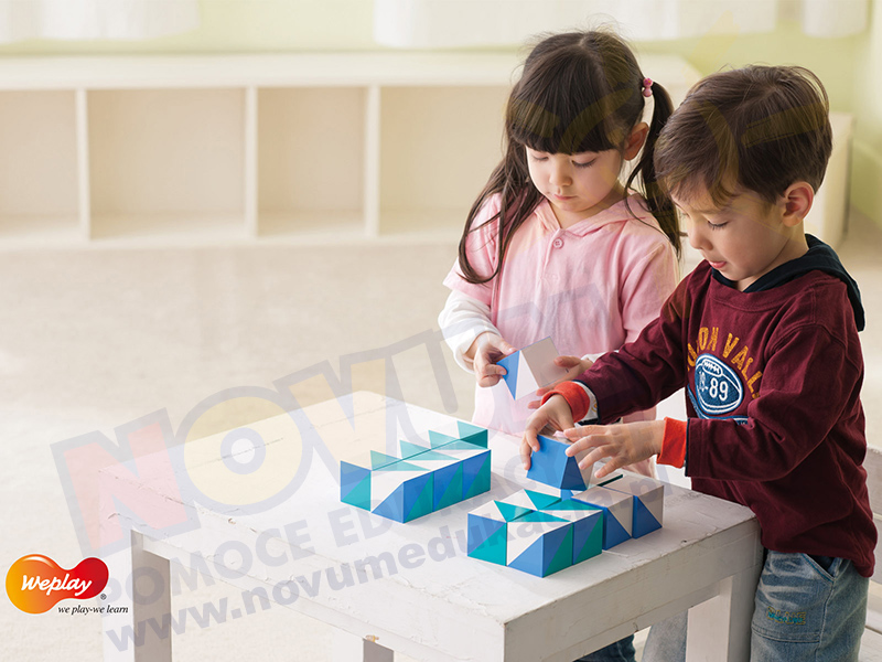W zestawie 16 klocków z elementami graficznymi i 6 przykładowych wzorów do układania. Zabawa klockami rozwija logiczne myślenie, wyobraźnię przestrzenną i zdolność przewidywania. Całość zapakowana w praktyczne plastikowe pudełko z wieczkiem. Wym. klocka: 5 x 5 cm.