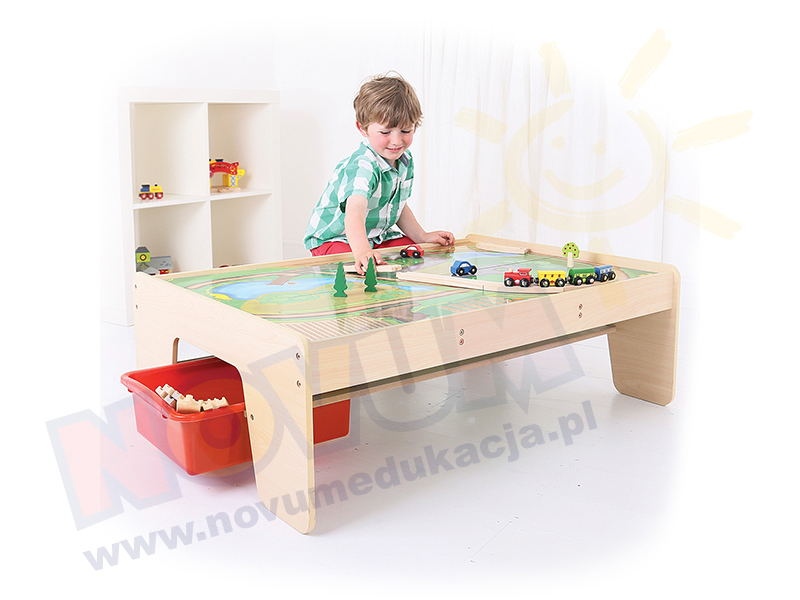 Stolik do zabawy kolejką z poręcznymi pojemnikami ułatwiającymi przechowywanie. Wym.: 102 x 73 x 32 cm
