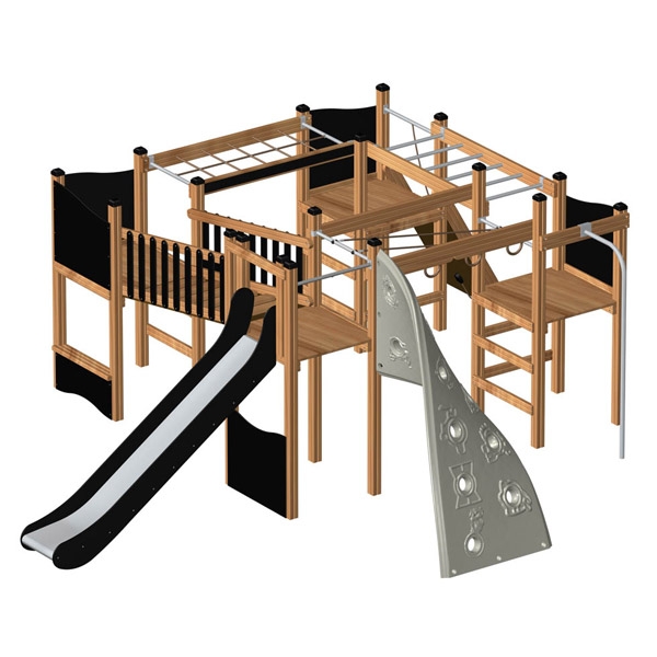 Zestaw Julia to niezwykle bogata kompozycja wież, zjeżdżalni, trapów, zestawów do przewrotów, mostków i innych elementów sprawnościowych. Projekt został stworzony z myślą o dużych publicznych placach zabaw, gdzie ilość bawiących się dzieci przekracza 50 osób. Elementy integracyjne wzbogacają zabawę, a różnorodność funkcji sprawia, że zestaw jest doskonałą opcją dla wszystkich grup wiekowych. Urządzenia z kolekcji eko charakteryzują się futurystycznymi kształtami dachów, barierek oraz wypełnień ze sklejki wodoodpornej. Konstrukcja urządzenia jest wykonana z drewna sosnowego litego, pomalowanego na kolor orzechowy.