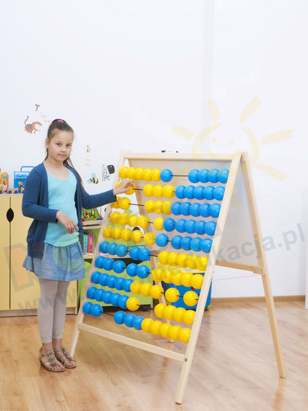Duże liczydło klasowe Liczydło i tablica magnetyczna w jednym. Niezbędne wyposażenie każdej sali przedszkolnej i szkolnej, niezwykle pomocne podczas nauki liczenia w zakresie do 100. Solidne klasowe liczydło wykonane z drewna, z jednej strony ma 10 rzędów korali (po 5 w każdym kolorze) z zaznaczeniem przekroczenia pięćdziesiątki, zaś z drugiej magnetyczną tablicę suchościeralną, z markerem w zestawie. Zalety: - solidna, trwała, konstrukcja, - druty liczydła malowane proszkowo, co zapewnia trwałość i chroni przed korozją, - duże korale łatwo chwycić i przesuwać. Wymiary: - 10 metalowych pretów o śr. 5 mm i długości 100 cm, - 50 piłek żółtych o śr. 8 cm, - 50 piłek niebieskich o śr. 8 cm, - tablica: 63 x 98 cm, - liczydło: 134 x 110 x 77 cm.