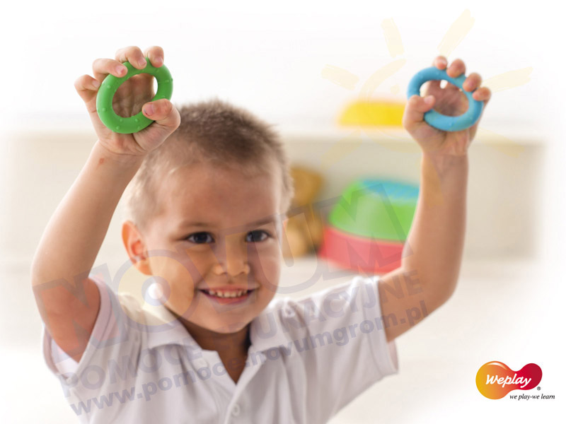 Zabawa ściskaczem pobudza krążenie krwi w dłoniach i palcach, wzmacnia mięśnie, masuje dłoń. W zestawie 6 szt. o śr. 6,5 cm i gr. 1,3 cm.