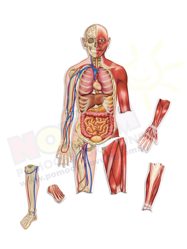 Dwustronny, duży, magnetyczny zestaw demonstracyjny prezentujący budowę ciała człowieka: układ kostny, główne organy, grupy mięśni. Wys. 90 cm.