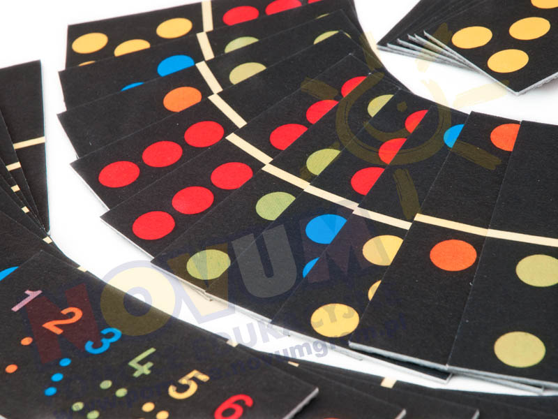 Zestaw 28 dużych, podłogowych dywaników-kostek domina do gier i zabaw edukacyjnych. Każda kostka jest podgumowana. Wym.: 10,5 x 21 cm. Całość zapakowana w plastikowy pojemnik o wym.: 37 x 25 x 6,5 cm