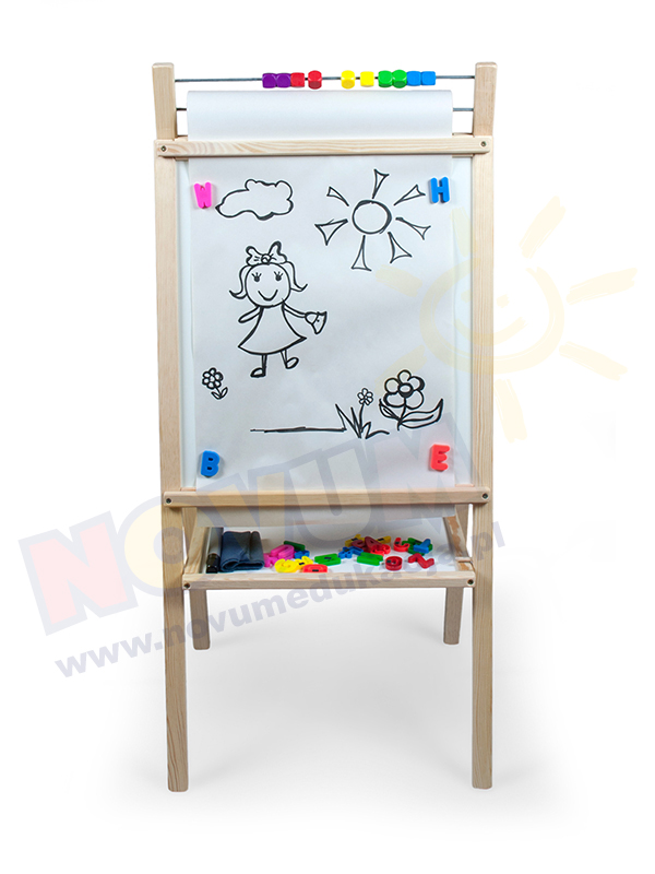 Tablica 5 w 1 Z jednej strony klasyczna kredowa, do pisania kredą markerami kredowymi , z drugiej strony magnetyczna, na magnesy i do pisania kolorowymi markerami. Na samej górze tablicy znajduję się rolka papieru do rysowania o długości aż 20 metrów oraz kolorowe liczydło. Wykonana solidnie w stylu klasycznym, z drewna i wysokiej jakości materiałów. Zawiera komplet akcesoriów w zestawie do nauki liczenia i pisania a nawet nauki czasu.Wysokość dopasowana do wzrostu 4 i 5 latków. Zalety tablicy: - tablica 2 w 1, kredowa i magnetyczna, - wykonana z drewna w stylu klasycznym, - wyposażona w rolkę papieru o długości 20 m,- posiada kolorowe liczydło z kulkami o śr. 3,5 cm, - zegar z ruchomymi wskazówkami, - w zestawie 5 kolorów kredy, - marker, - gąbeczka, - polar do wycierania markera, - alfabet umieszczony na tablicy o wym.: 3 x 20 cm- drewniane elementy konstrukcji są zaokrąglene i wygładzone,- zestaw magnetycznych liter, - praktyczna półka na przybory o wym.:35,5 x 36 cm- produkt polski. Do tablicy można dokupić: 4255432 Magnetyczne litery małe4255433 Magnetyczne cyfry i symbole matematyczne6302867, 6302868, 6302869, 6302870 Markery kredowe Pozostałe informacje Stelaż wykonany z drewna.Pakowana w karton.Wymiary całej tablicy: Wys. 100 x szer. 45 x gł. 40 cm, powierzchnia robocza 40 x 43,5 cm, alfabet umieszczony na tablicy o wym. 3 x 20 cm, półka na akcesoria 35,5 x 36 cm