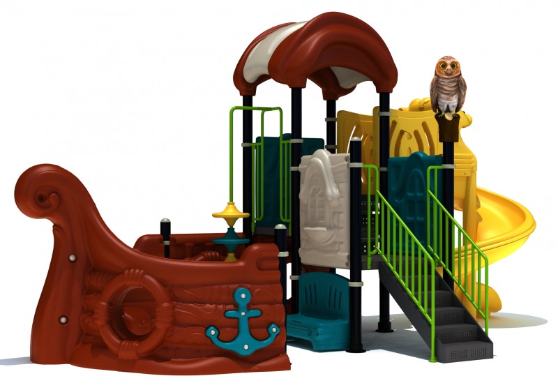 Kolorowy plac zabaw w kształcie statku. Zestaw wykonany ze stalowej konstrukcji, platformy i schodki metalowe jednocześnie powlekane PCV, zjeżdżalnia z podwyższonej trwałości tworzywa, elementy wykończeniowe z kolorowego tworzywa.