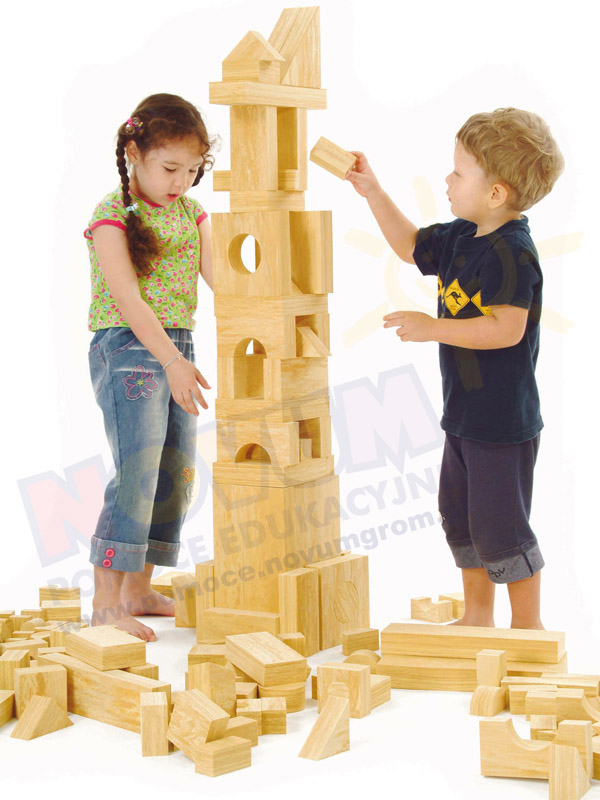 Klocki wykonano z miękkiej i nietoksycznej pianki, która doskonale imituje drewno. Duże i lekkie elementy nie stanowią zagrożenia dla dzieci nawet wtedy, gdy zabawa konstrukcyjna przeradza się w zwariowaną „rzucankę”. Dla dzieci powyżej 2 roku życia.