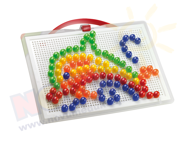 Zabawka edukacyjna pozwalająca rozwijać podstawowe umiejętności nabywane w wieku przedszkolnym, a więc umiejętności manualne i obserwacji. Zabawka, dzięki której dzieci mogą tworzyć fantazyjne mozaiki. Zawartość: 150 kołeczków o średnicy 15 mm, walizka, album z przykładami do odwzorowania. Wiek 4