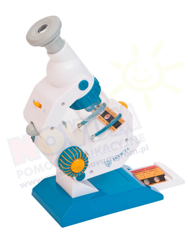 Mikroskop z regulacją, umieszczony na stabilnej, metalowej stopce z szufl adką, w której znajduje się 6 preparatów biologicznych. Daje powiększenie oglądanych obiektów: 300 razy (x100, x200, x300), 2 opcje podświetlania. Miękka uszczelka na okularze. Wysokość mikroskopu min. 29 cm. Wymaga baterii: 2 x AA.