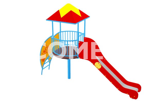 Nietypowa zjeżdżalnia z okrągłym podestem na jednej nodze, czterospadowym daszkiem z tworzywa sztucznego oraz drabinkowym wejściem, z poręczami i wypełnieniami bocznymi wykonanymi z tworzywa HDPE, które ozdobione są grawerowanymi wzorami. Zapewnia zabawę nawet pięciu użytkownikom, w przedziale wiekowym od 3 do 15 lat. Produkt spełnia wymogi polskiej normy PN-EN 1176:2009, co potwierdzają certyfikaty wydane przez Biuro Badań i Certyfikacji COBRABiD w Warszawie.