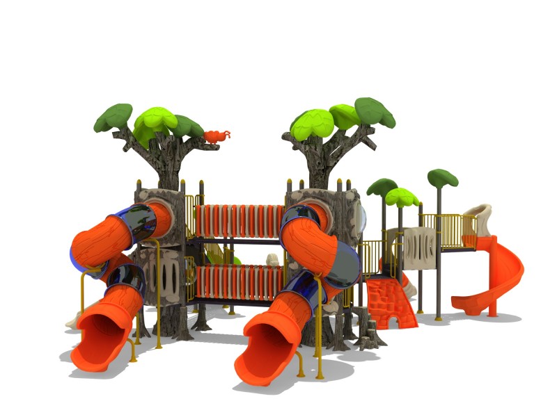 Kolorowy plac zabaw imitujący las. Zestaw wykonany ze stalowej konstrukcji, platformy i schodki metalowe jednocześnie powlekane PCV, zjeżdżalnia z podwyższonej trwałości tworzywa, elementy wykończeniowe z kolorowego tworzywa.