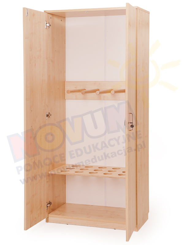 Szafa wykonana z płyty wiórowej laminowanej w kolorze klonu. Szafa posiada 10 przegród zamykanych drzwiczkami z metalowym uchwytem oraz zamkiem na kluczyk. Wym.: wys. 182 x szer. 80 x gł. 42 cm