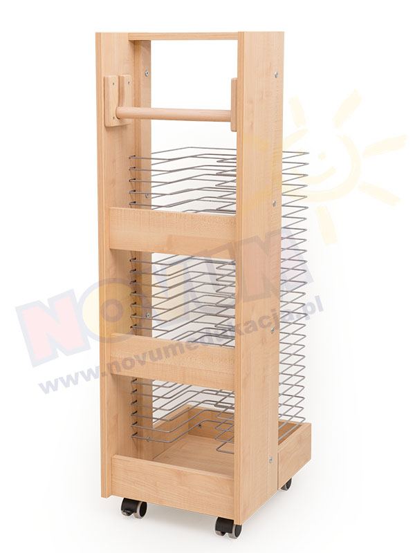Oszczędność miejsca Suszarka Standard na prace plastyczne zaprojektowana specjalnie z myślą o przedszkolach, cieszy się zaufaniem naszych klientów od lat. Dzięki niej możesz teraz suszyć prace plastyczne swoich podopiecznych: malowane farbami, tuszami a także wyklejane bez obaw, że ulegną zniszczeniu. Swoją funkcjonalność zawdzięcza kółeczkom i uchwytowi, które ułatwiają przestawianie mebla w dowolne miejsce tak aby mebelek nie przeszkadzał w prowadzonych zajęciach lub podczas zabawy. Zalety suszarki: - posiada 25 poziomów i pomieści prace plastyczne formatu A3, wszystkich wychowanków, - kółeczka ułatwiają przemieszczanie, - wygodny uchwyt, - estetycznie wykonana w kolorze naturalnego drewna z kolorowymi akcentami, dzięki czemubędzie komponowała się do mebelków w każdym przedszkolu. Wykonanie - pręty wykonane ze stali malowanej proszkowo, nie rdzewieją, - stelaż wykonany z trwałej i estetycznej sklejki o grubości 12 mm Dodatkowe informacje Suszarka posiada deklarację CEGwarancja: 2 lata Wymiary suszarki: wysokość 83 cm, szerokość 36 cm, głębokość 38 cm Wymiary poziomów: 32 x 34 cm, odległość między prętami ok.2,5 cm