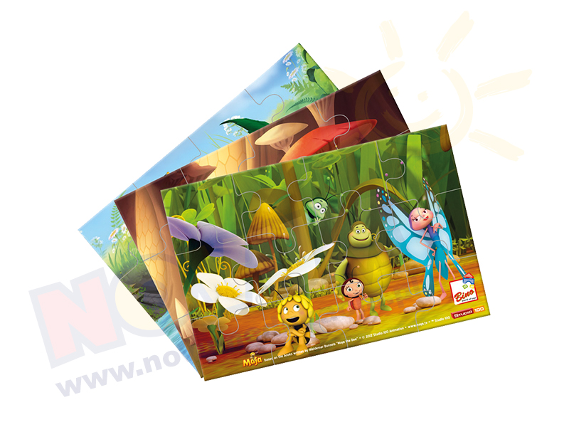 Cztery sztuki puzzli w drewnianym pudełku z posatciami z bajki Pszczółka Maja. Ilość elementów: 4 x 12 sztuk. Wym.: 19,5 x 3,5 x 14 cm