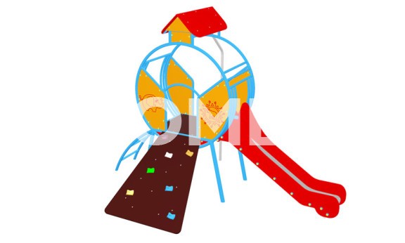 Zjeżdżalnia połączona z zadaszoną wieżyczką i wejściem w postaci łukowej drabinki, świetnie sprawdzi się na każdym placu zabaw i sprawi radość zarówno młodszym , jak i starszym dzieciom ( przedział wiekowy 3-15 lat). Dodatkową atrakcją jest ścianka wspinaczkowa z guzami chwytnymi zamontowana w jednej ze ścianek bocznych. Stalowa konstrukcja, podest z wodoodpornej sklejki antypoślizgowej, daszek i wypełnienia z tworzywa HDPE, ześlizg z blachy nierdzewnej – wszystko to zapewnia trwałość i bezpieczeństwo użytkowania. Produkt spełnia wymogi polskiej normy PN-EN 1176:2009, co potwierdzają certyfikaty wydane przez Biuro Badań i Certyfikacji COBRABiD w Warszawie.